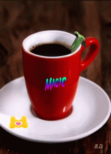 A red coffee mug with 'MAGIC' text, featuring a small hummingbird and a heart-shaped charm.