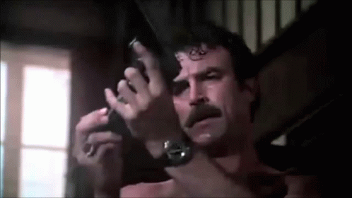 Tom Selleck as Magnum P.I. in an action scene, holding a gun and looking intense.
