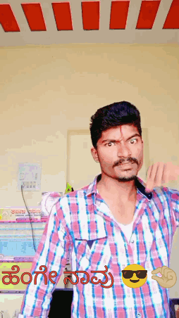 Mahi Mahesh making exaggerated and funny facial expressions in a plaid shirt.