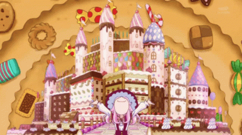 A Mahou Tsukai Witchy Precure character stands before a vibrant candy castle in a sweet kingdom.