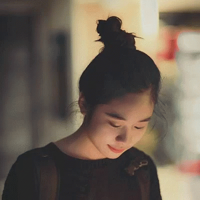 Mai Lan Juno_okyo, a woman with her hair styled in a bun, looks down thoughtfully.