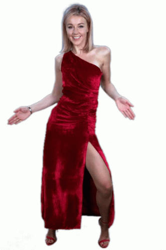 Yulianna Karaulova dances energetically in a stunning red velvet dress, surrounded by musical notes.