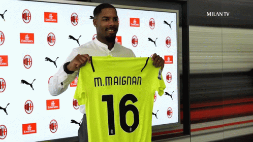 Mike Maignan proudly holds up his new AC Milan jersey with number 16, smiling for the camera.
