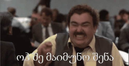 Man with mustache laughing and pointing, exclaiming 'You monkey, you' in Georgian.