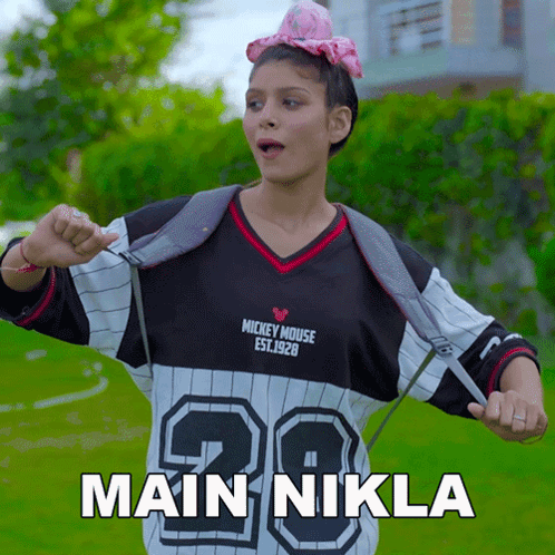 Rinki Chaudhary energetically performs to 'Main Nikla', wearing a Mickey Mouse shirt and backpack, gesturing with enthusiasm.