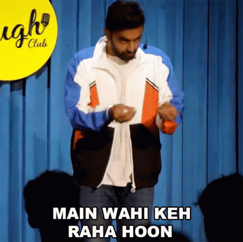 Comedian Rahul Dua delivers a punchline with the phrase 'Main Wahi Keh Raha Hoon' during his stand-up.