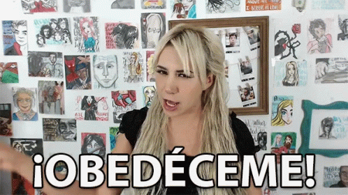 Maire Wink commands '¡Obedéceme!' (Obey Me!) in front of a wall of drawings.