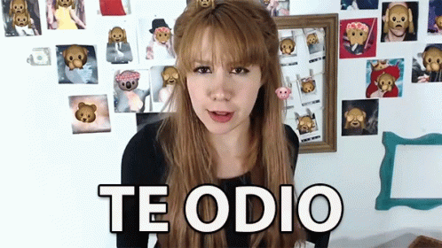 Maire Wink expresses anger, saying 'Te Odio' with a pouty face in front of an emoji-decorated wall.