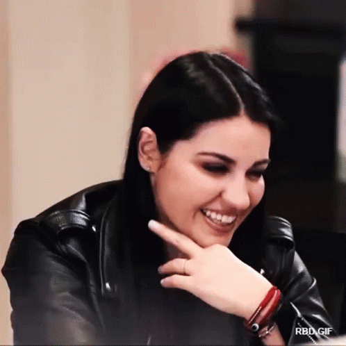 Maite Perroni, a Mexican actress, laughs shyly, covering her mouth with her hand.