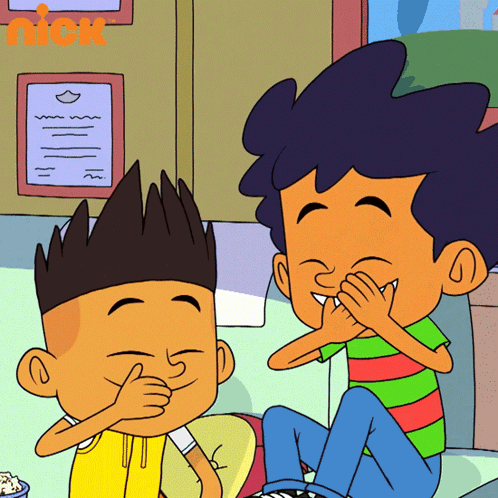 Sammy and Raj from The Twisted Timeline of Sammy & Raj share a hilarious moment, covering their mouths while laughing.