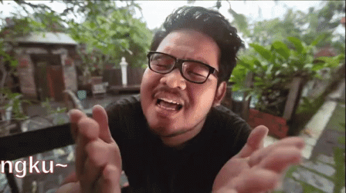 A man with glasses expresses gratitude with a funny face, saying 'Terima Kasih Sayangku' (Thank You My Dear).
