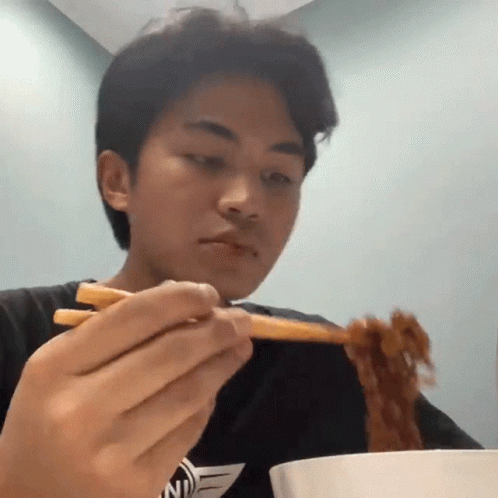 Zahid Azmi Ibrahim enjoys a meal of noodles, skillfully eating with chopsticks from a white bowl.