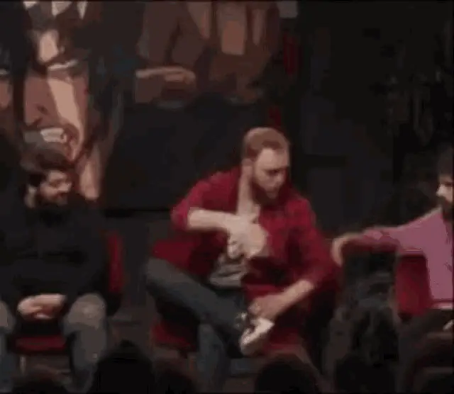 Makar from ChBD gets up, shakes hands, and leaves the stage during a funny moment.