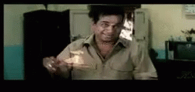 Brahmanand in a tan shirt, making funny expressions while holding a small burning object in an indoor setting.