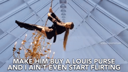 Renni Rucci swings from a chain next to a chandelier, with the bold caption: 'MAKE HIM BUY A LOUIS PURSE AND I AIN'T EVEN START FLIRTING'.