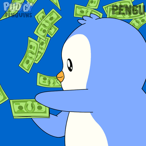 a cartoon of a penguin holding a stack of money with the word penguins on the bottom right