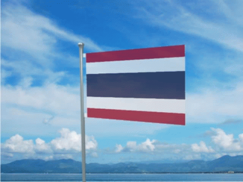 The national flag of Thailand waves proudly against a clear blue sky over a scenic ocean and mountains.