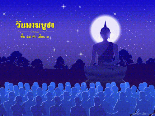 Makha Bucha Day (Māgha Pūjā) celebration with a Buddha statue, full moon, and a crowd of devotees.