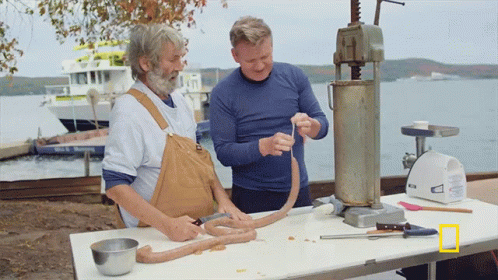 Gordon Ramsay and a local expert craft homemade fish sausages by a lake, using a traditional sausage stuffer.