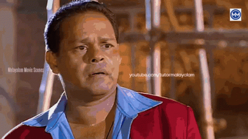 Actor Innocent in a classic Malayalam comedy scene from Mannar Mathai Speaking, looking around in a red jacket.