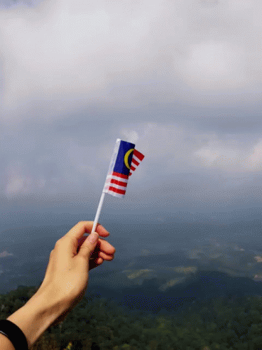 A hand proudly holds a small Malaysian flag against a scenic backdrop of clouds and green mountains.
