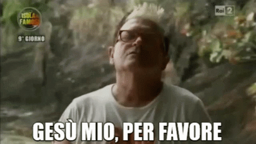 Cristianomalgioglio from Isola dei Famosi says 'Gesù Mio, Per Favore' with an expressive, pleading look.