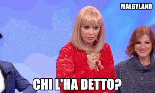 Tina Cipollari from Uomini E Donne, wearing a red dress, famously asks 'Chi l'ha detto?' (Who said that?).