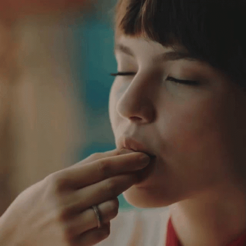 Rita (Alanis Guillen) savoring a delicious chocolate with her eyes closed, wearing a ring.