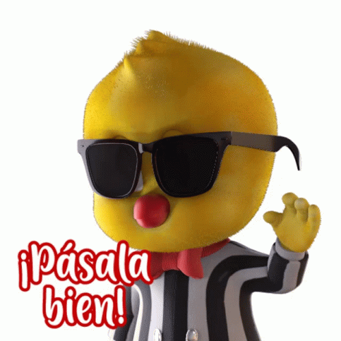 Pollito Malher, the yellow cartoon chick, winks and lifts his sunglasses, saying '¡Pásala bien!' (Have a good time!).