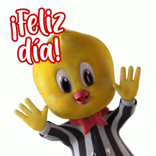 Pollito Malher, the yellow chick character, waves happily with a '¡Feliz día!' greeting.
