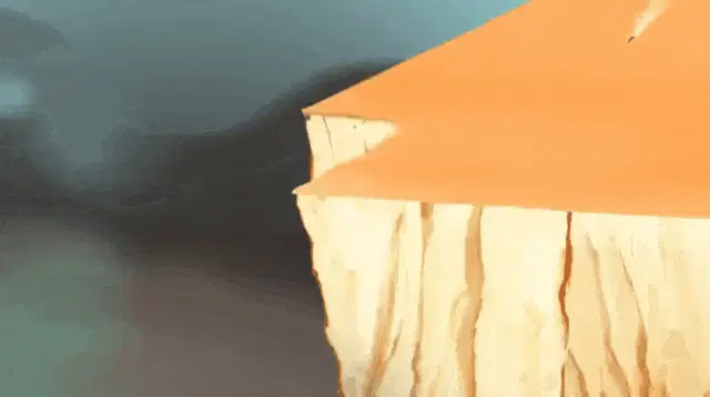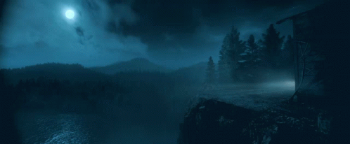 A car, possibly a Prius, drives to the edge of a malignant cliff on a dark, misty night under a full moon.