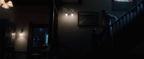 A woman in a dark, eerie room holds a bottle, looking around nervously in a scene from Malignant.