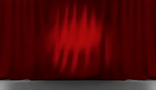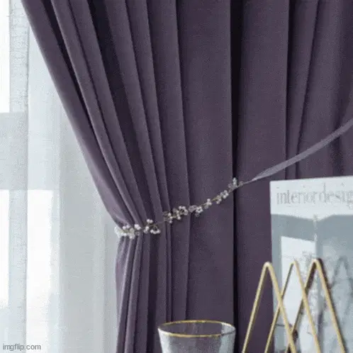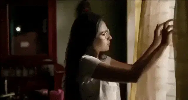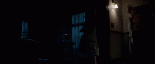 A woman in a gray robe closes curtains in a dark room, a scene from the movie Malignant.