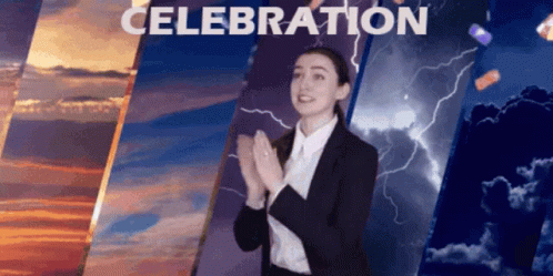 Malinda Kathleen Reese applauds enthusiastically amidst a festive celebration with falling confetti.
