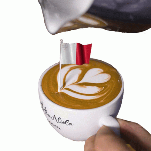 Dritan Alsela creates beautiful latte art featuring the Malta flag in a coffee cup with his name written on it.