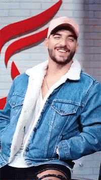 Maluma flashes a charming smile, sporting a denim jacket with a sherpa lining and a stylish pink baseball cap.