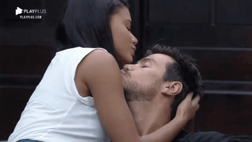 Malyne and a man share a tender kiss, followed by affectionate moments and smiles.