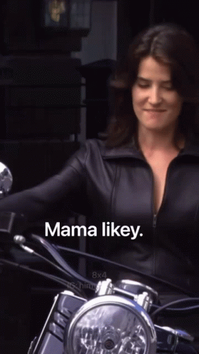 Robin Scherbatsky, in a black leather jacket on a motorcycle, smiles and says 'Mama likey'.