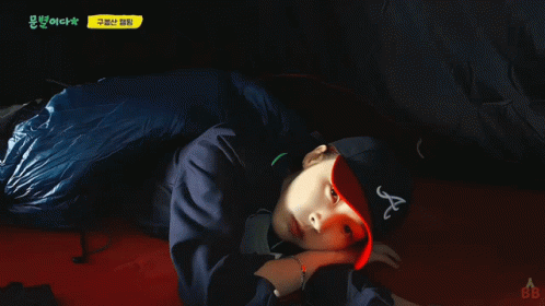 Mamamoo's Moonbyul rests peacefully in a dimly lit tent, wearing a cap with a red brim.