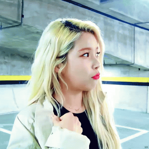 Mamamoo's Solar with blonde hair and red lips, making a playful expression in a parking lot.