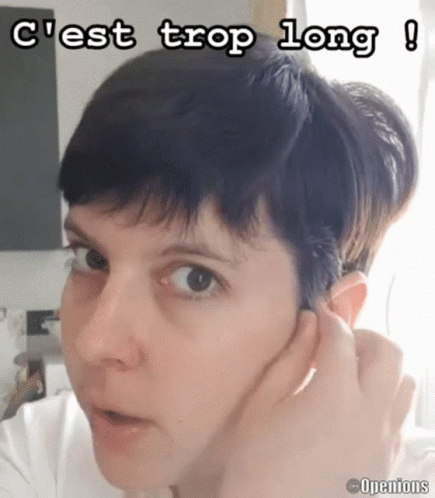 Mamflower expresses frustration, saying 'C'est trop long!' (It's too long!) while touching her hair.