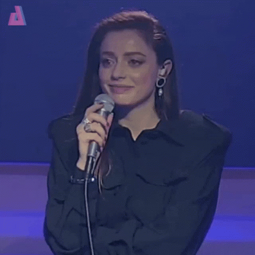 Annalisa reacts with 'Mamma Mia' and 'Una Roba...' while holding a microphone on stage, showing surprise.