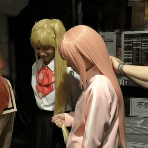 a woman in a pink jacket is standing next to a woman in a blonde wig