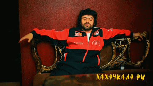 Man in a red and black racing jacket sits on a couch, smiling and then shaking his fist with determination.