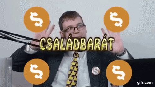 A man in a suit and tie is surrounded by dollar signs and the Hungarian word 'CSALÁDBARÁT'.