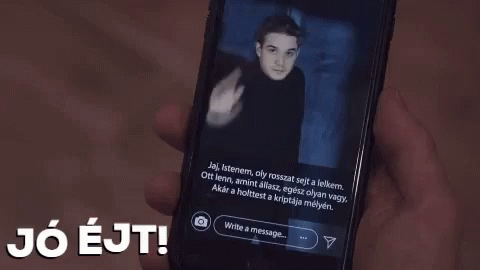 Vecsei Miklos on a phone screen with Hungarian text 'JÓ ÉJT!' (Good Night) and a dramatic quote from Romeo and Juliet.