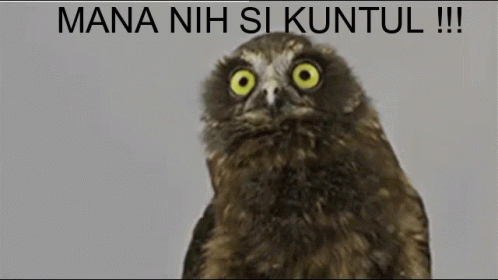 A wide-eyed owl, associated with Handi Wiharja and the phrase 'Mana Nih Si Kuntuk', looks surprised.