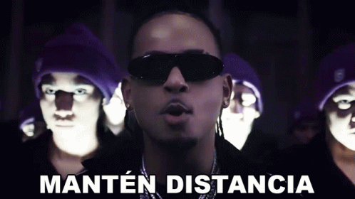 Ozuna in a music video, singing "Mantén Distancia" with backup figures in the background.