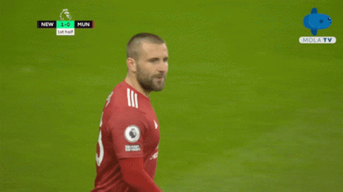Luke Shaw of Manchester United on the field during a football match, with the score 1-0 in the first half.
