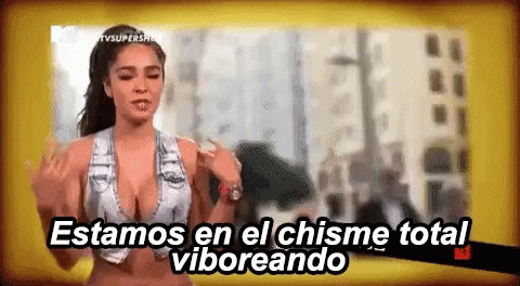 Manelyk from Super Shore gossiping, saying 'Estamos en el chisme total viboreando'.